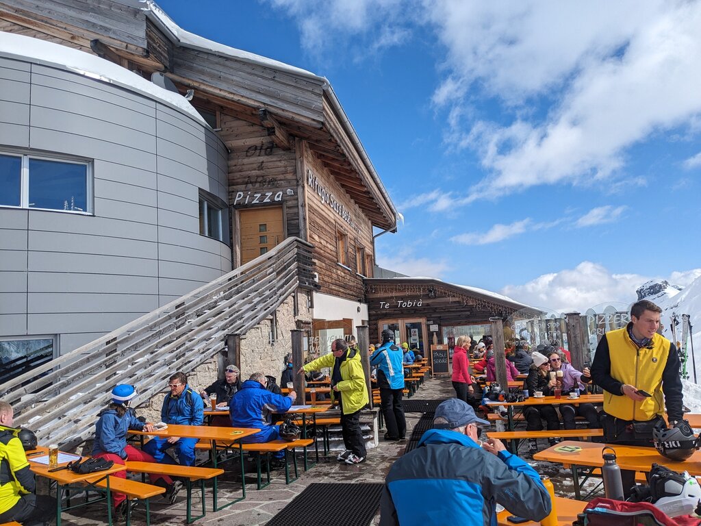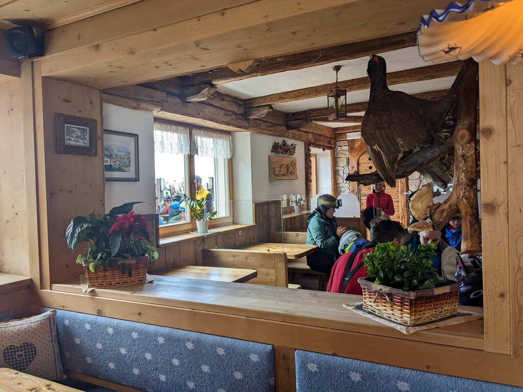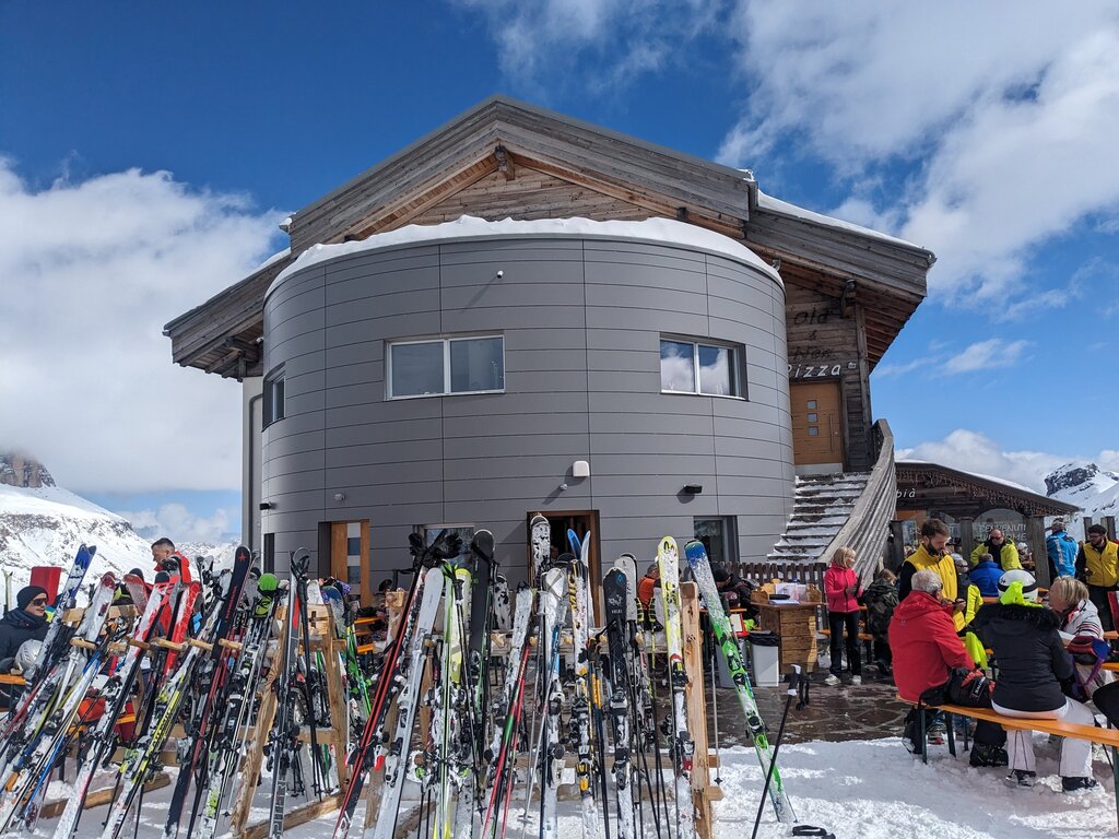 Mit der Langkofelgruppe vor, der Sella und der Marmolada an den Seiten und hinter den venezianischen Dolomiten, ist diese Berghütte eine Oase für den Anblick und den Geschmack.