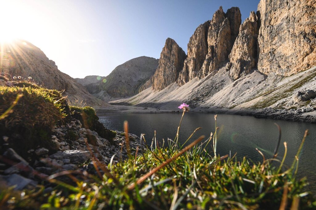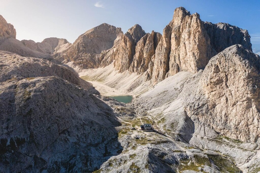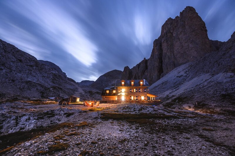 Lasst euch nicht von der Entfernung zum Rifugio Antermoia abschrecken, das 1911 im Vallon d’Antermoia erbaut wurde. Auf diejenigen, die dort oben ankommen, wartet eine Entschädigung: Die Aussicht auf den Gletschersee. Es ist der einzige im Rosengarten und besonders faszinierend, wenn es im Sommer taut und er tiefblau leuchtet. Hier erwartet Martin Riz, Bergführer und Rettungshelfer genau wie seine Vater Luigi und Großvater Silvio, der folgt auf den vorigen Betreiber Almo Giambisi. Die Hütte, die nur im Sommer geöffnet ist,