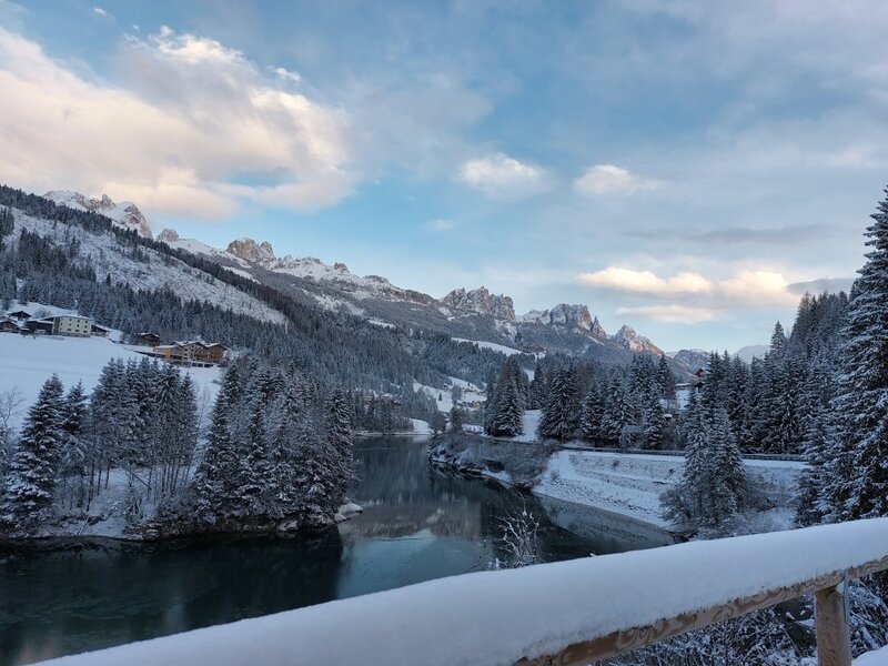Ein Spaziergang zwischen Moena und Soraga. Die Route, die von oben am Pecé-See vorbeiführt, ist landschaftlich sehr reizvoll, da sie von der Rosengarten- und Langkofelgruppe und rechts vom langen Kamm des Cima Dodici umgeben ist.