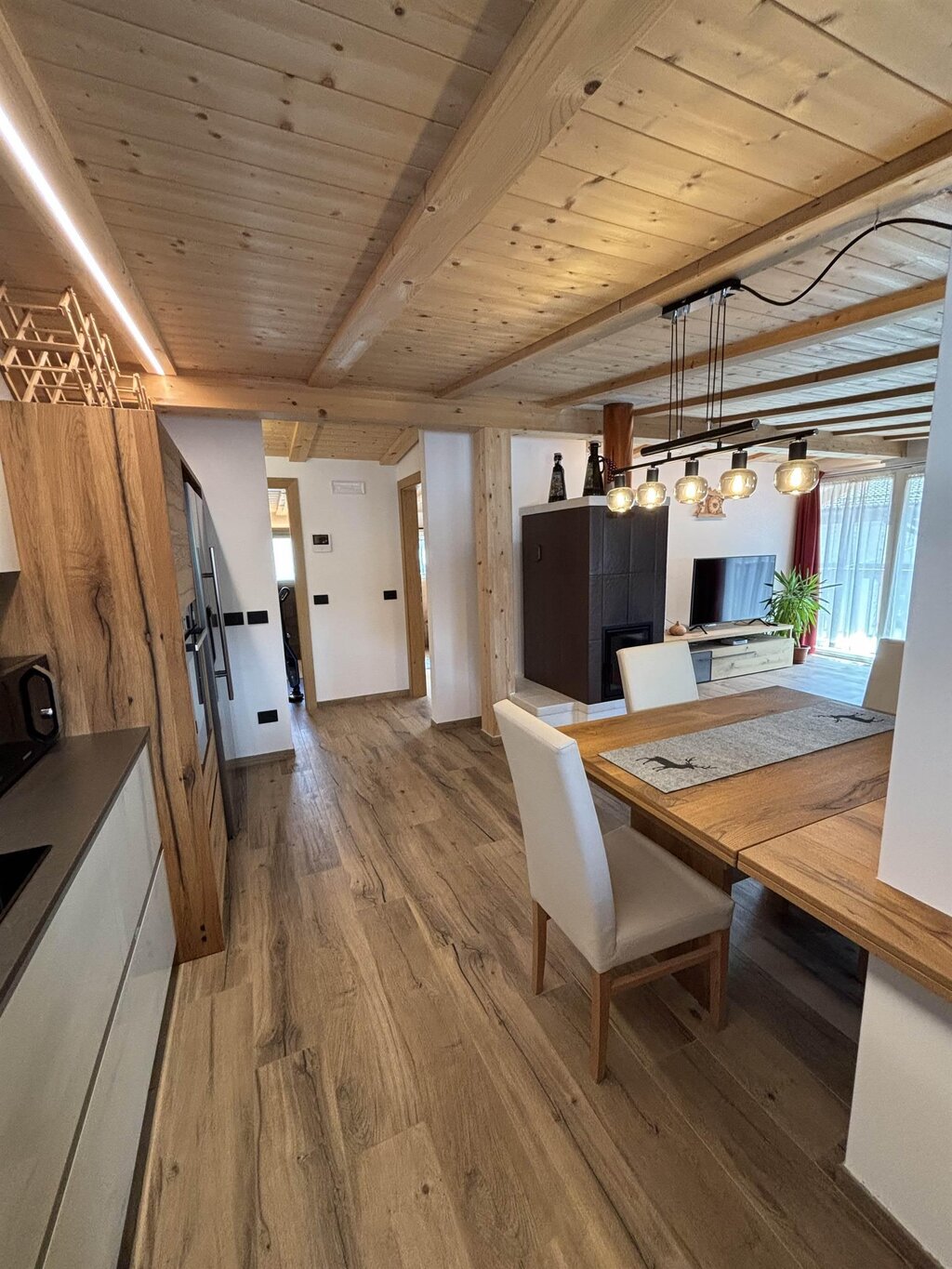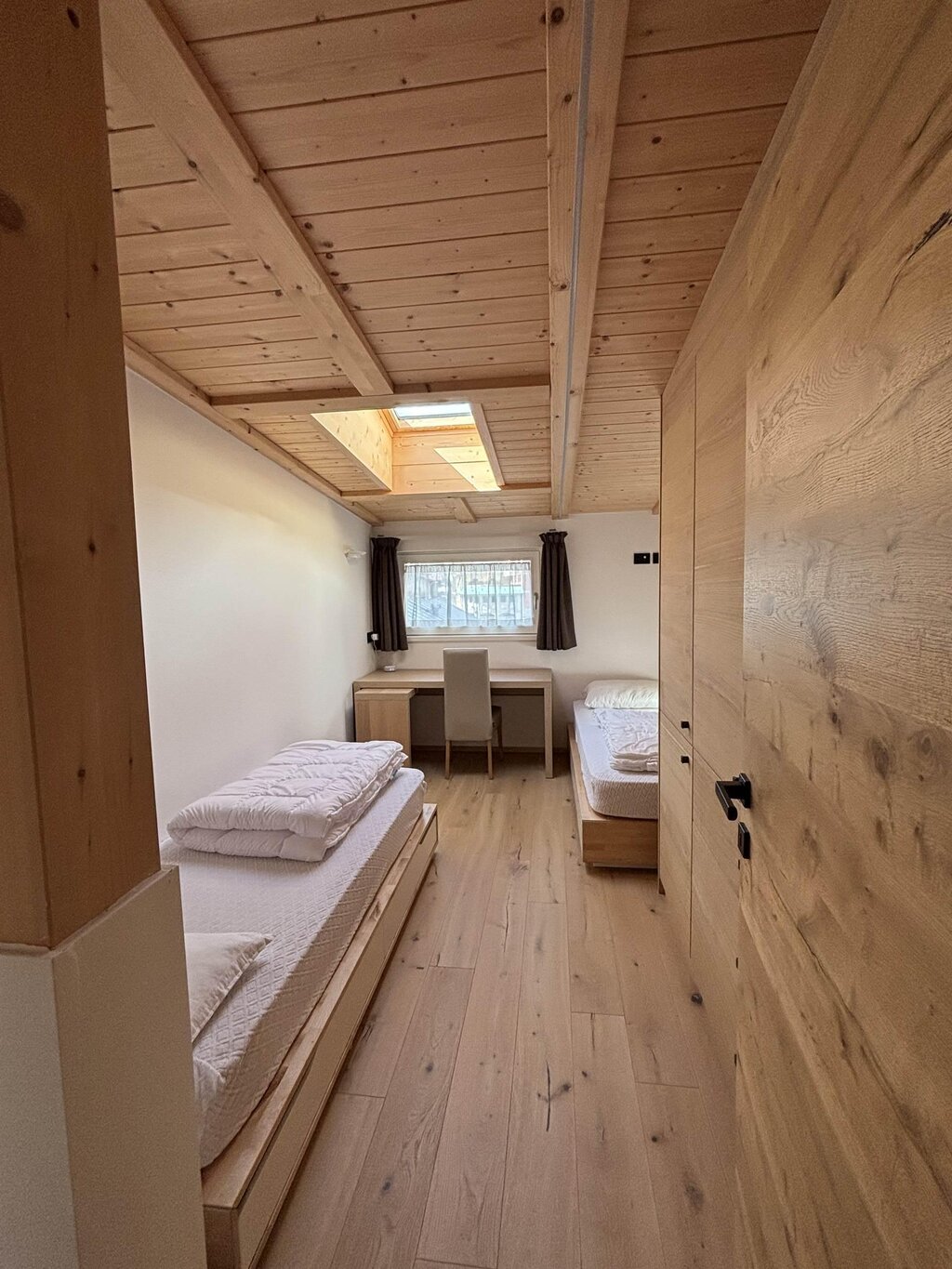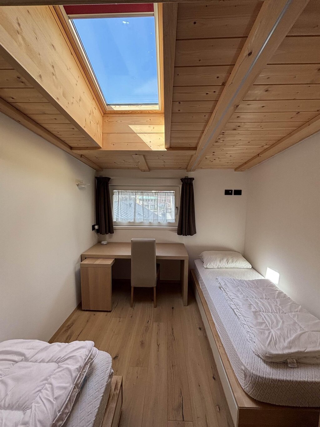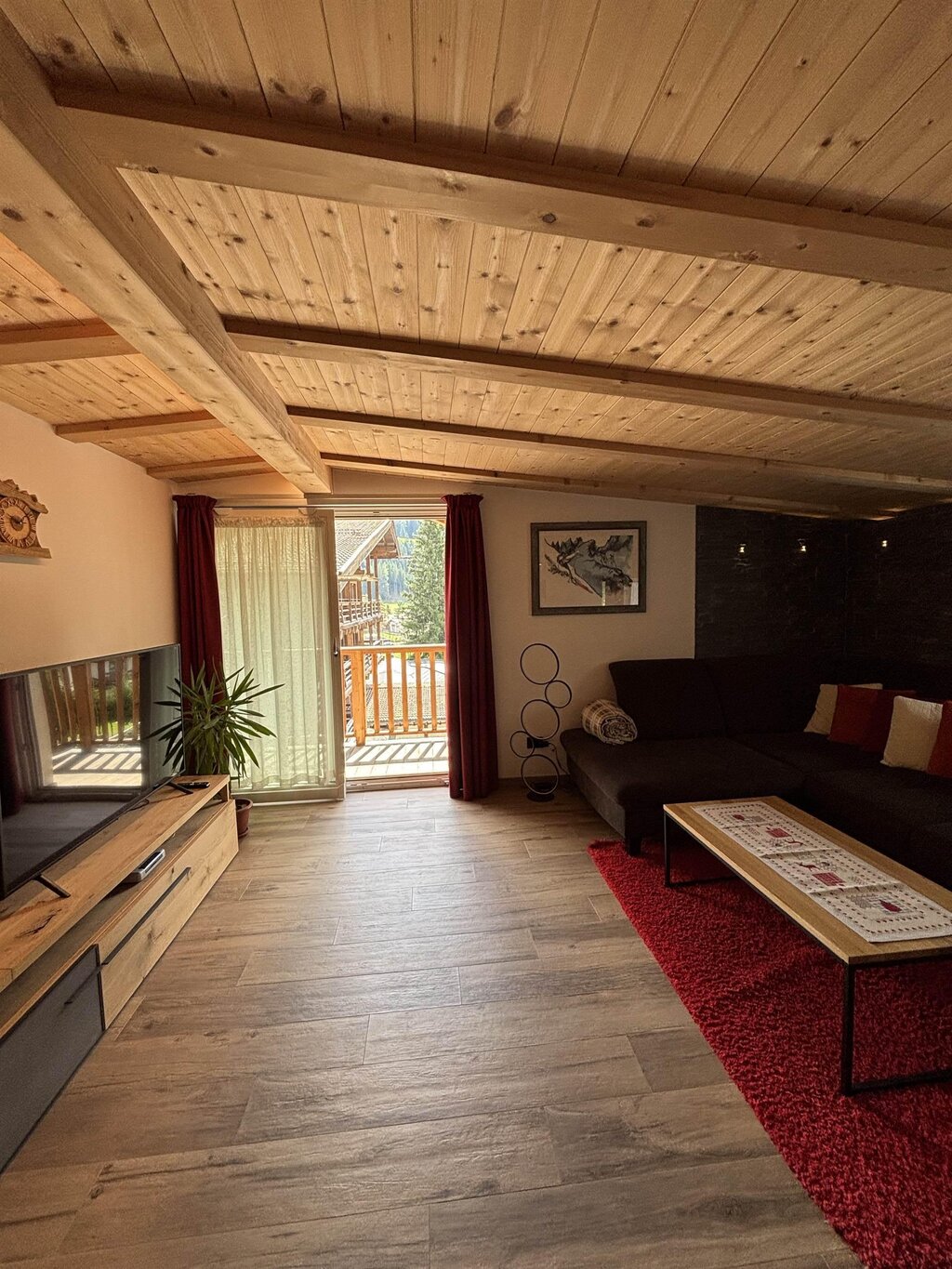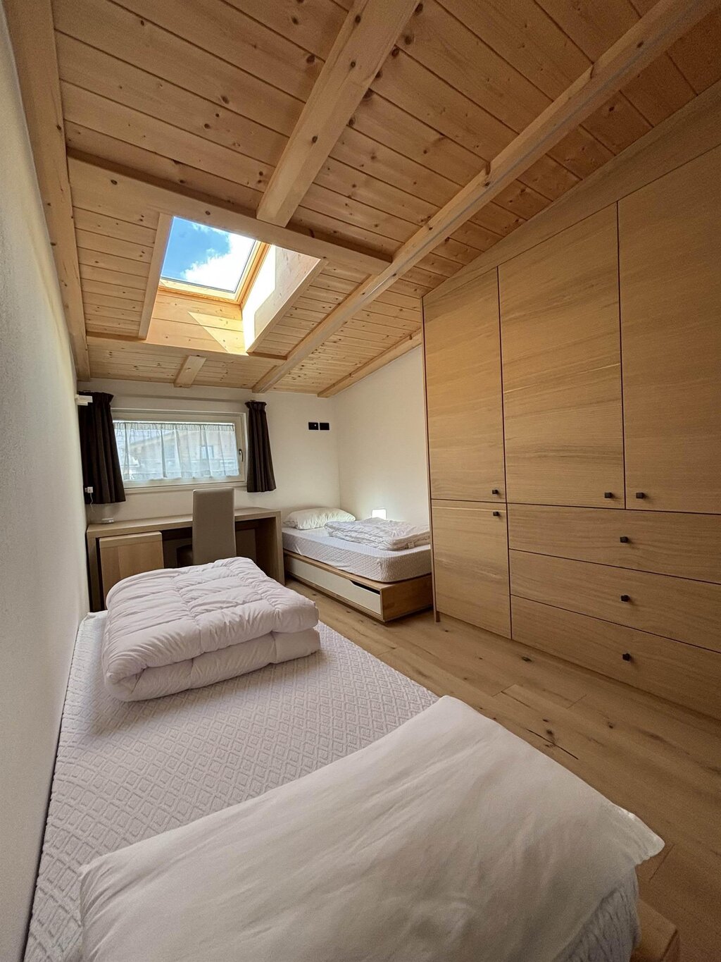Cima12 Apartment (80 sqm) is located in Pozza di Fassa, a great starting point for winter hikes, just a few steps from the bus and Skibus stop and only a 5-minute walk from the QC Terme Dolomiti spa, as well as from the main restaurants and the Conad supermarket. The Buffaure-Ciampac ski area (which, thanks to the connection with the Dolèda Funifor lift, directly links to the Sellaronda circuit) is 1 km away and can be reached either by car or via the Skibus (with a stop just a few meters from the apartment). Located in the attic, recently built, and finely furnished in wood following the Dolomite style. Very quiet and bright, with a warm and intimate atmosphere, it is the ideal choice for couples of friends or families looking for maximum comfort. It features: Double bedroom with memory foam mattress and 43” Smart LED TV facing the bed Twin bedroom with two single beds and a desk Bathroom with large crystal shower and rain shower head, equipped with washing machine Living room with 55” Smart LED TV and traditional Ladin stove Fully equipped open-plan kitchen with dishwasher, oven, microwave, 4-burner induction cooktop, double-door American fridge with cold water dispenser and ice maker Small balcony with a view of Cima12 Independent boiler Underfloor heating Oak parquet flooring in the bedrooms and porcelain stoneware flooring in the living area and bathroom Fully wooden ceiling with exposed beams Velux skylights in the rooms for additional light Adjustable lighting system to create a relaxing atmosphere WiFi Internet throughout the apartment 1 parking space Non-smoking apartment