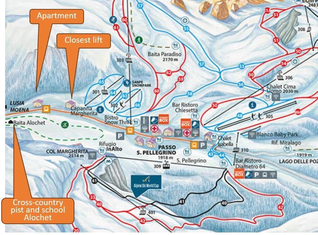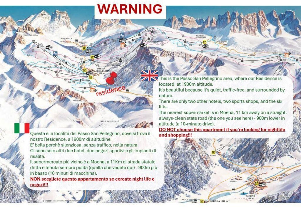 The apartment is located at Passo San Pellegrino, directly on a blue slope of the San Pellegrino / Alpe Lusia ski area, thus connected to the Costbella ski lift. It is 10 km from Moena, easy to reach, and is on the third floor of a residence. The rental of the apartment grants access to the APT Trentino Guest Card, which offers discounts for ski buses and attractions in the area. The floors, fixtures, systems, kitchen, and bathroom were completely renovated in July 2023. The apartment is ideal for a maximum of two adults and one child, and smoking is ABSOLUTELY PROHIBITED (not even on the balcony). (CIN: IT022118C2KERIHEUJ)