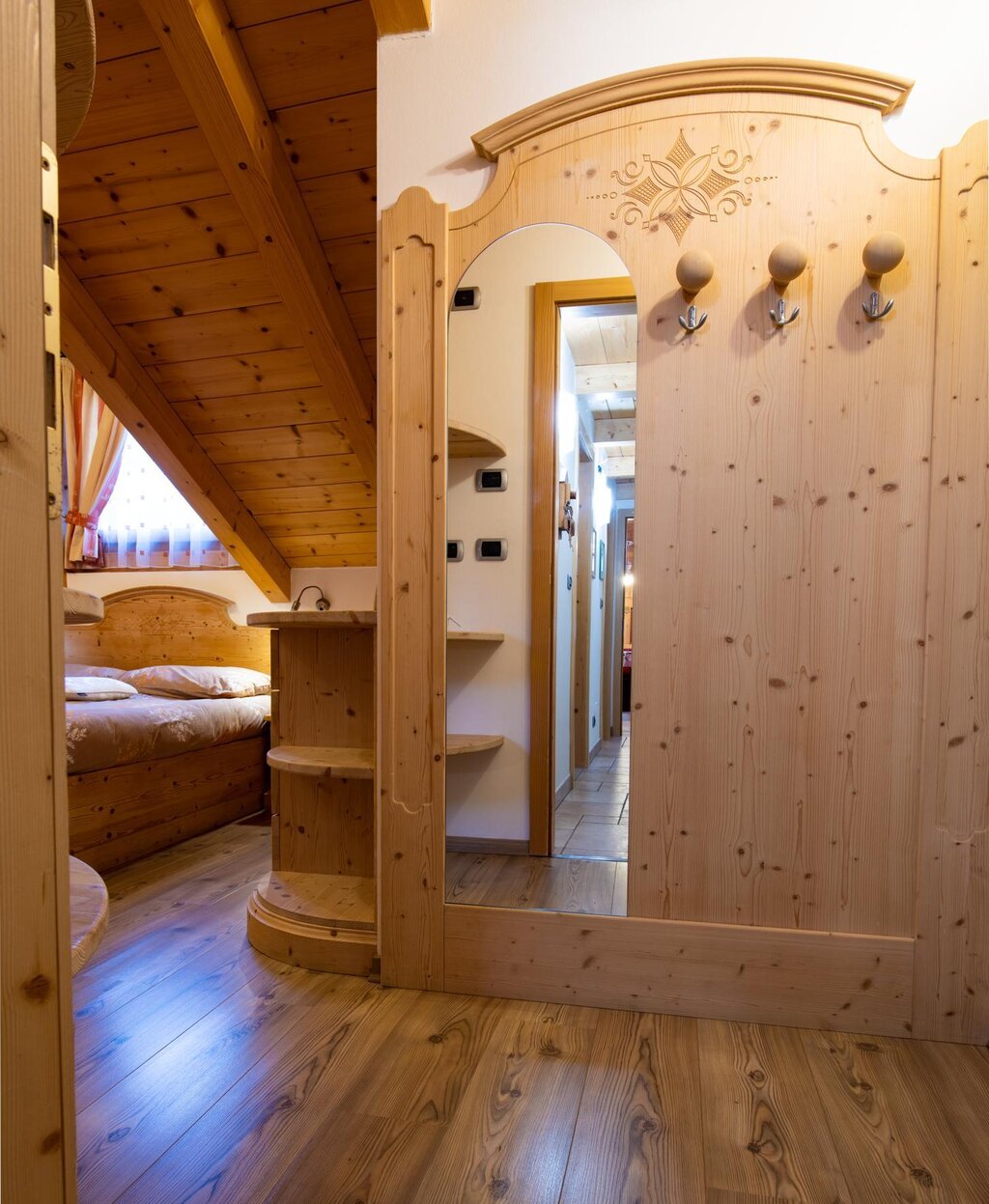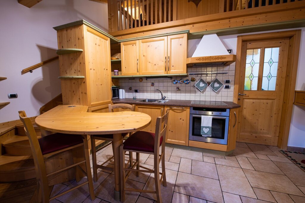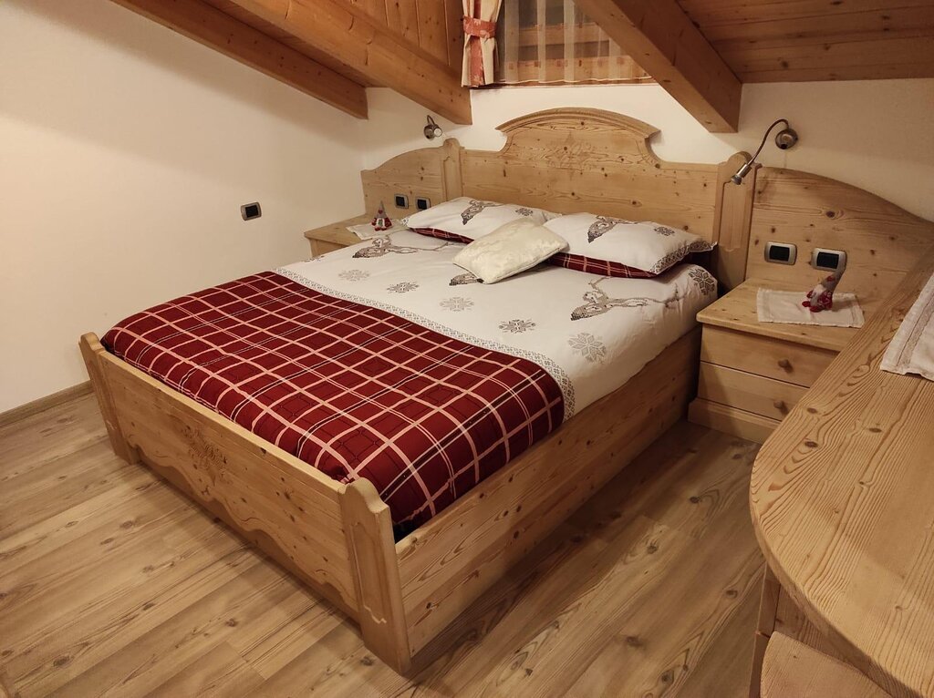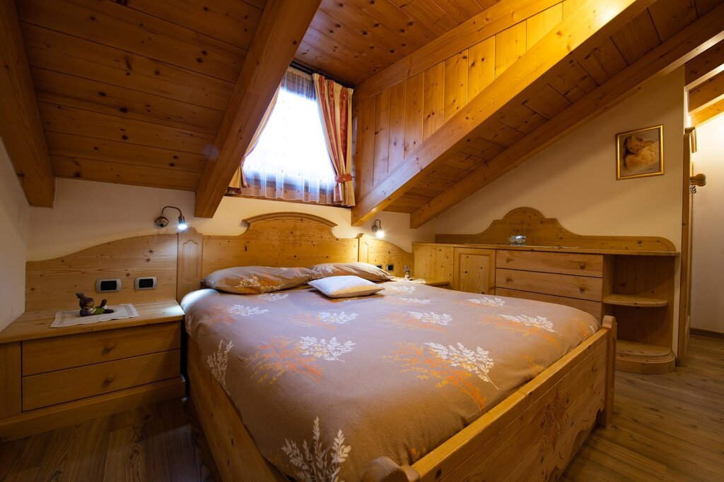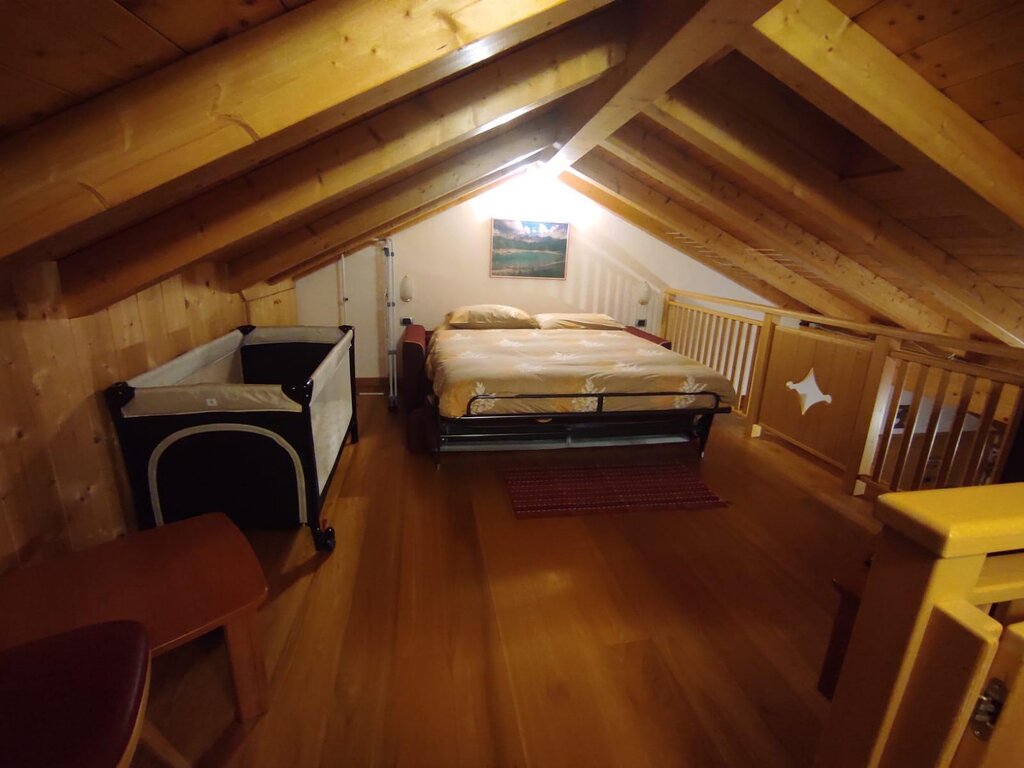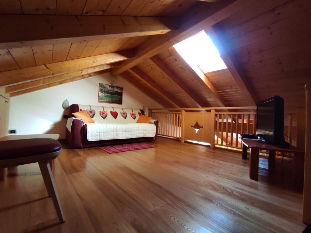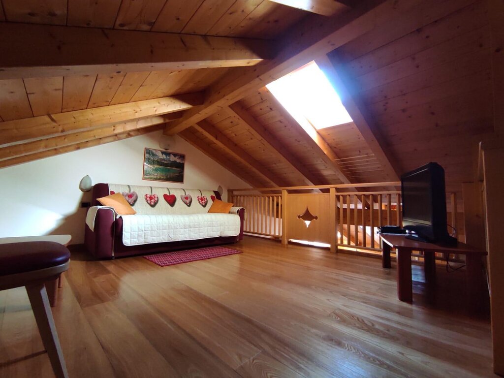 Our flat is situated in a quite zone but at the same time right in the centre of Vigo di Fassa, two minutes walk from the Ciampedie Ski area and from all the shops in town. It is situated on the second floor in a mansard and it consists of a kitchen/living area, master bedroom, one bedroom with two single beds, a living room on a mezzanine with a convertible sofa, which can be used as double bed, a bathroom complete with bathtube and shower. The garage on the ground floor is at your disposal as utility room for skis, suitcases etc. We have also a ski boot dryer for you. The flat has a 24h free WIFI connection, Smart television set with Sat, radio, hair dryer, iron with ironing board, washing machine, microwave oven, toaster, electric kettle, refrigerator, safe. We also have a parking spot adjacent to the flat.