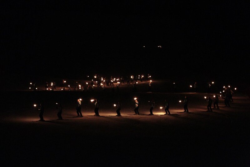 Traditional end-of-year torchlight procession at sunset, with ski instructors descending the "Le Coste" slope
