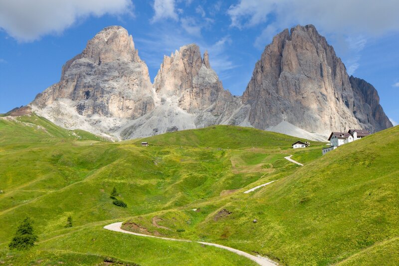 The route connects Canazei to the Sella Pass and then to Col Rodella, across the vast pastures of Val Salei. Along the ascent we encounter the Basaltic Waterfalls, a peculiar hexagonal rock formation.