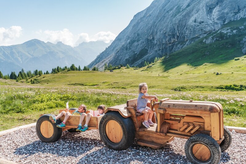 An unforgettable day? Conquer the Ciampac basin together with your children by cable car and then let them drive every vehicle that moves in the mountains. With a final prize!