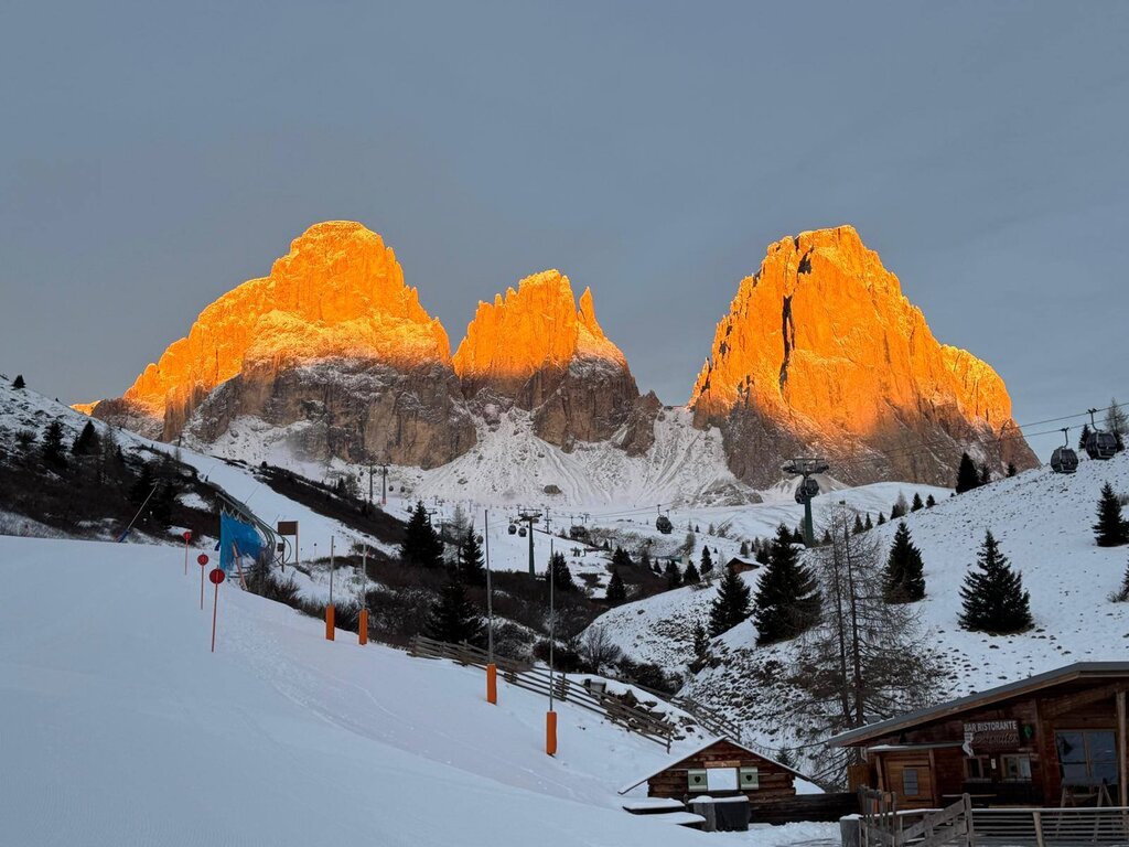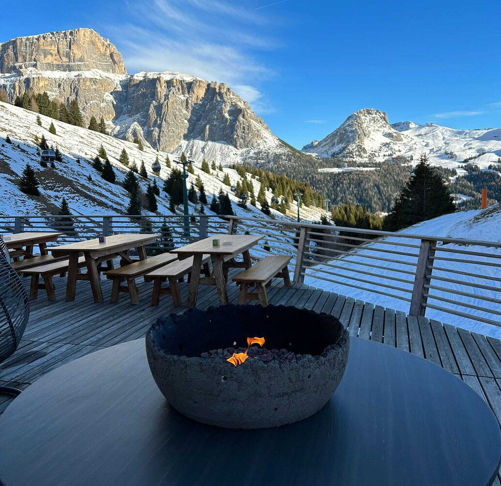 On the spectacular 3-Tre ski slope, 3.3 km of thrills that connect Col Rodella to Pian de Frataces (White Wolf, above Canazei) along the Sellaronda, is the 3-Tre Dolomites Restaurant Bar. Outside it looks like a rustic and secluded cabin, with wooden planks and beams and a terrace overlooking the peaks of Sassolungo, Sella, Pordoi and Marmolada. Once you cross the threshold, you will be enveloped by a warm and modern environment, where furnishings recovered from old barns tell mountain stories and dialogue with contemporary lines with an elegant design. With only forty seats in the room, every moment here becomes special: from the aperitif to lunch, to the magical snowmobile dinners under the stars.