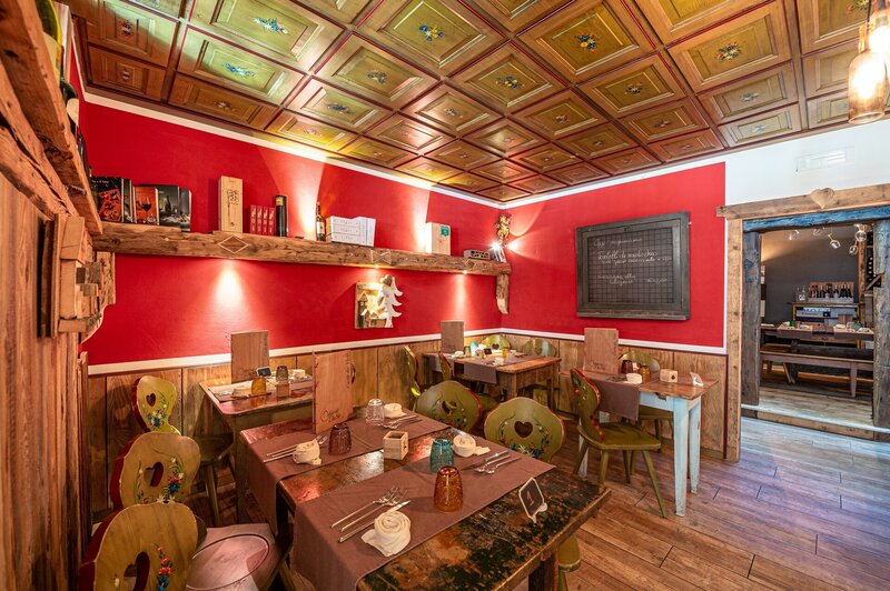This is how the restaurant, or rather Ostaria DaStè, looks like, overlooking the pedestrian/cross-country track that connects Campitello to Canazei. The room is very characteristic, made of wood, furnished exclusively with salvaged objects from old farmhouses in Trentino. The atmosphere is intimate, relaxed and welcoming, so much so that you will be gladly entertained at the end of the meal for a chat with the owner Davide. In the kitchen, chef Stefano mixes local specialities with Emilian and Lazio specialities in great style. The result? Tasty, well-balanced and generous dishes in portions. Sweets are love at first sight. The cellar reflects a great passion for wine with a rich offer of labels that can also be tasted at the glass.