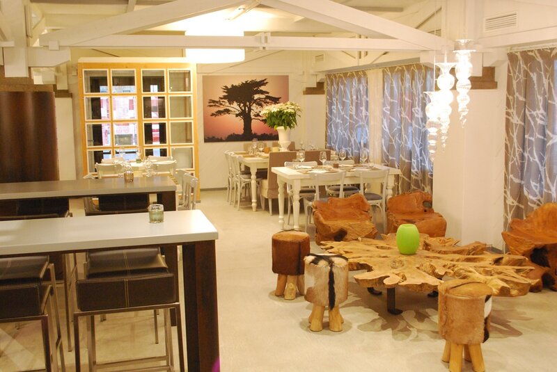 Outside, a typical wooden structure; inside, a restaurant with a modern shabby chic style. Welcome to Albana.