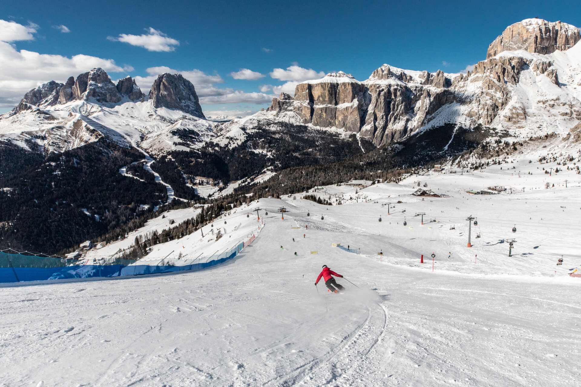 From here, descend along the Kristiania slope, ride back up with the Sass Becé chairlift, cross towards Arabba and reach the Pordoi Pass with the Maria chairlift. A 700-metre vertical ascent by cable car takes you to Sass Pordoi - the Terrace of the Dolomites at 2,950 metres: an unmissable experience, where the Catinaccio, Sassolungo and Marmolada unfold before you like a sea of stone and light. The return journey flows along the Pordoi slope and the Gonzaga ski lift, closing the loop back at Pecol.