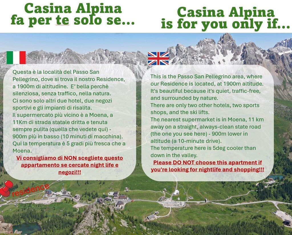 L'appartamento si trova al Passo San Pellegrino, sui sentieri trekking del complesso dei Monti Monzoni, vicino all'impianto di risalita Costbella, aperto anche in estate. Dista 10 km da Moena, è facile da raggiungere ed è al terzo piano all'interno di un residence. Pavimenti, infissi, impianti, cucina e bagno sono stati completamente rinnovati a Luglio 2023. L'appartamento è ideale per massimo due adulti e massimo un bambino, ed è ASSOLUTAMENTE VIETATO FUMARE (neanche sul balcone). (CIN: IT022118C2KERIHEUJ)