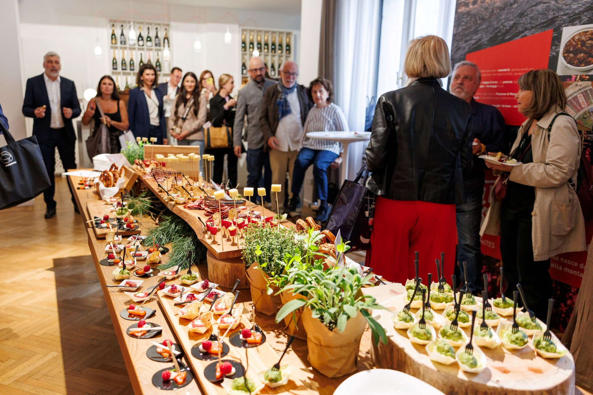 Spazio anche ai sapori della Val di Fassa: i “ciajoncie” (ravioli, in ladino) e un buffet di prodotti locali, preparati da Moreno Valentini con Elmar Depietro e Gaetano Bonanno, hanno raccontato il territorio con gusto.