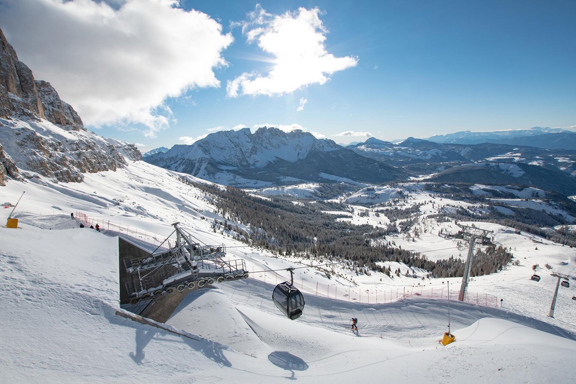 Raggiungere Carezza è già un viaggio nella storia. La Grande Strada delle Dolomiti, che dal 1909 collega Bolzano a Cortina d’Ampezzo, attraversa il Passo Costalunga: porta d’accesso a una delle skiaree più panoramiche e suggestive delle Dolomiti. È un mosaico di possibilità, dove lo sci incontra la leggenda di Re Laurino. Piste ampie e soleggiate, disegnate tra boschi e radure, ideali tanto per chi ama la tecnica quanto per chi muove i primi passi sulla neve. A ogni curva le guglie del Catinaccio e del Latemar accompagnano la discesa, infiammate all’alba e al tramonto dallo spettacolo dell’Enrosadira.