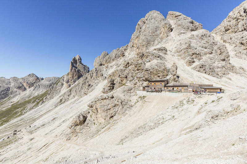 Il Rifugio Passo Principe - Grasleitenpasshütte - nel Rosengarten, al riparo di una roccia e alla base della cima più alta del Catinaccio, è un crocevia di sentieri a cavallo tra il Trentino e il Sudtirolo.