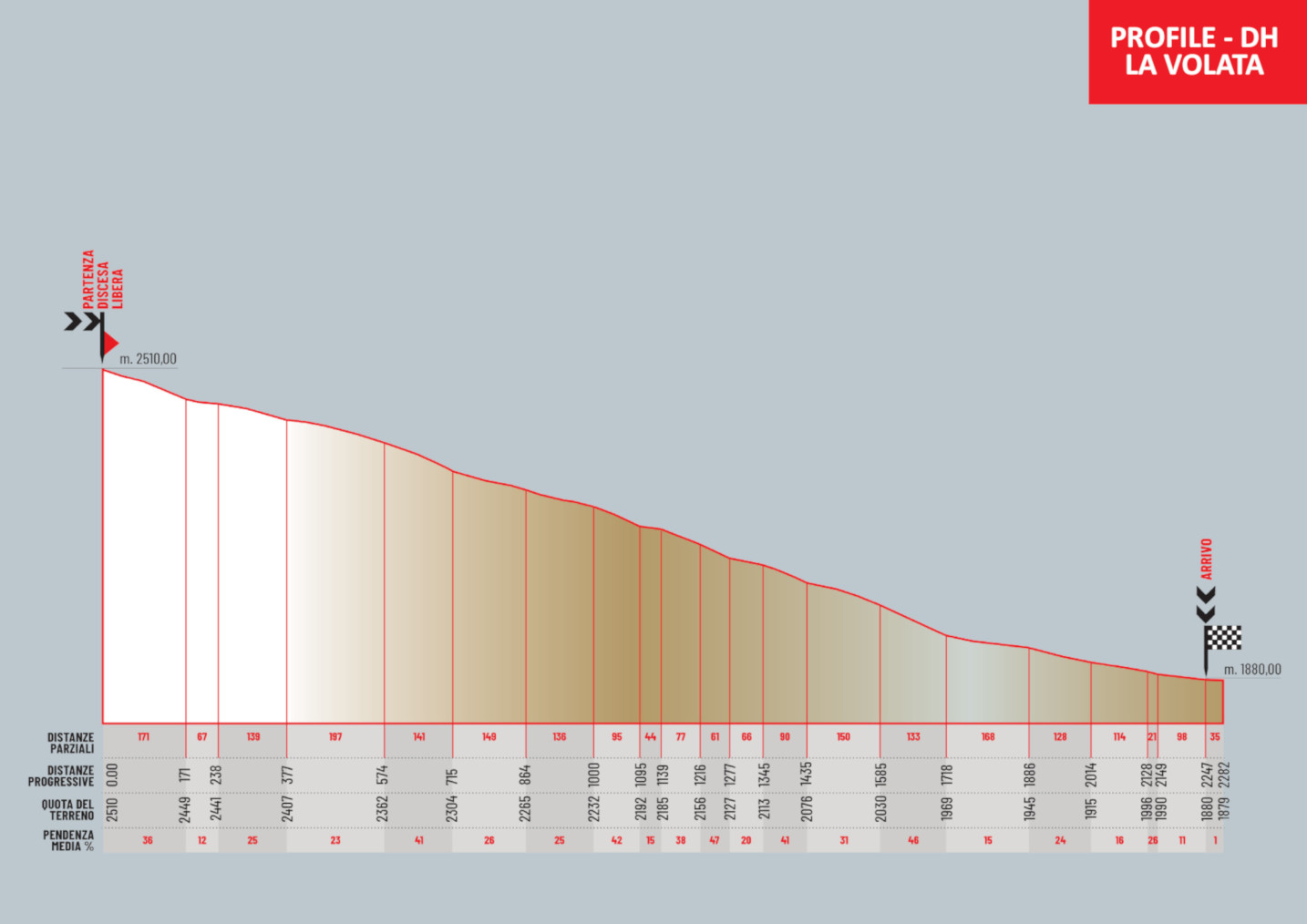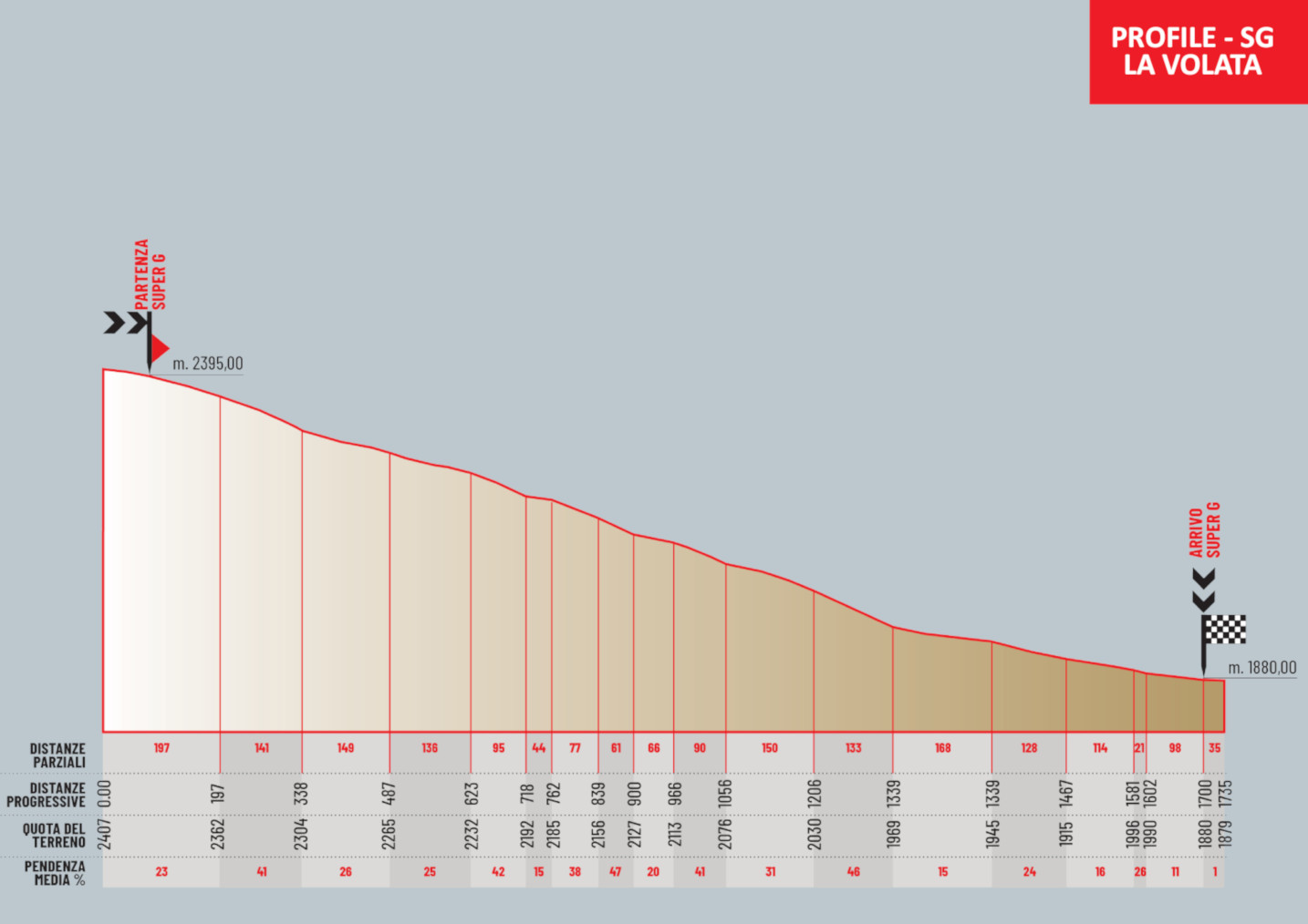 Il tracciato di gara prende il via a quota 2.480 metri da una terrazza naturale in porfido che domina lo spettacolare panorama delle Pale di San Martino. Fin dai primi metri la pista invita alla velocità, ma richiede lucidità e sensibilità assoluta nell'interpretare i cambi di pendenza in rapida successione. Con una pendenza media del 28,4% e punte che raggiungono il 47%, La VolatA in versione SuperG esalta la scorrevolezza e la capacità di intuire la linea giusta, curva dopo curva. Una pista nera che alterna tratti veloci e passaggi tecnici, dove i centesimi si decidono nei dettagli.